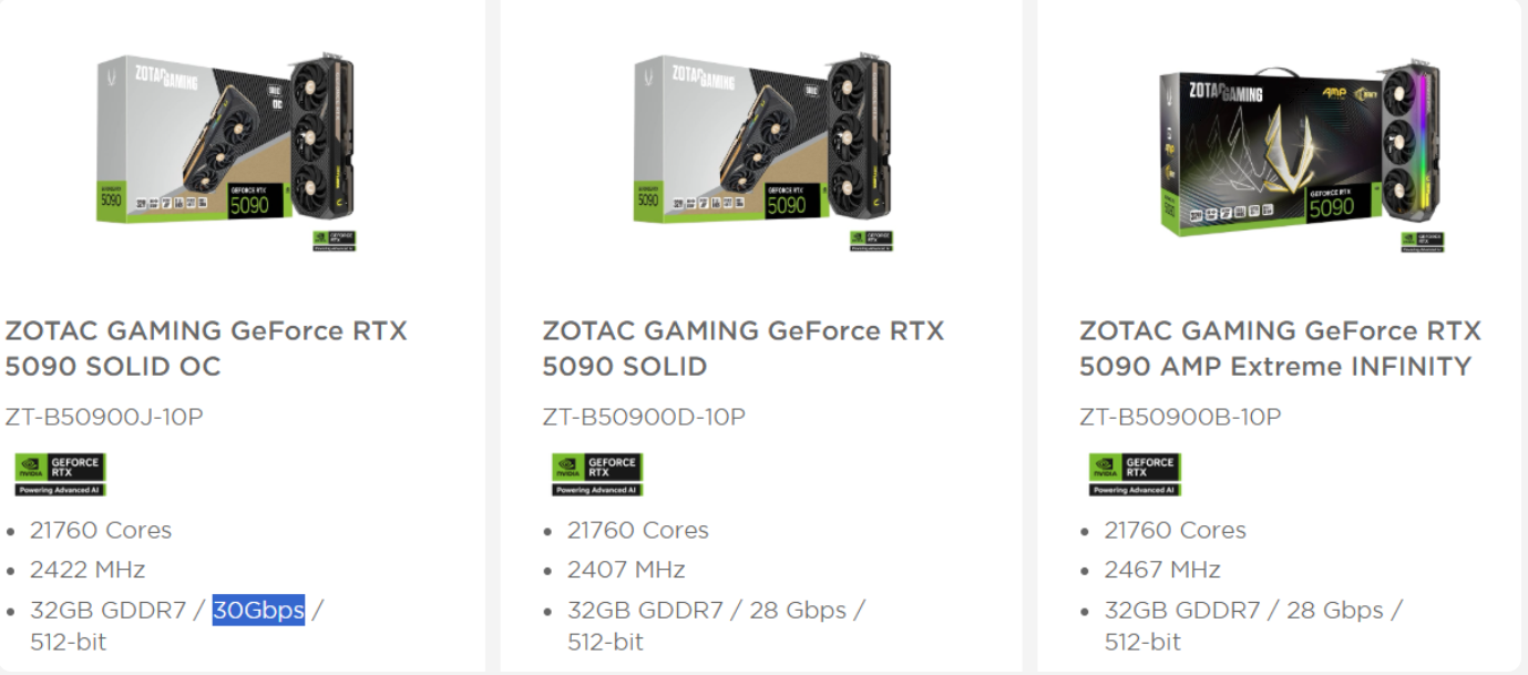 ZOTAC a indiqué des spécifications pour sa RTX 5090 avec une mémoire de 30 Gbps. Il s'agit du seul modèle ZOTAC répertorié avec ce type de mémoire. Fait intéressant, le modèle SOLID OC n'est pas le produit le plus haut de gamme de ZOTAC. En effet, la société a déjà listé le modèle AMP Extreme Infinity, qui dispose d'une fréquence GPU plus élevée. Par conséquent, le modèle SOLID OC avec une mémoire à 30 Gbps est probablement une erreur et ne reflète pas les spécifications correctes.